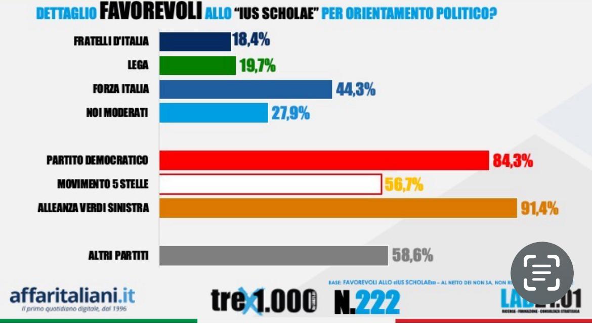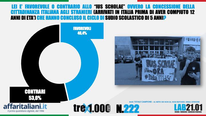 La maggioranza assoluta degli italiani, pari al 53,6%, è contraria allo Ius Scholae proposto da Forza Italia e che non piace alla Lega e a Fratelli d’Italia. Lo rivela il sondaggio realizzato per Affaritaliani.it da Roberto Baldassari, direttore generale di Lab21.01. Favorevole solo il 46,4%.