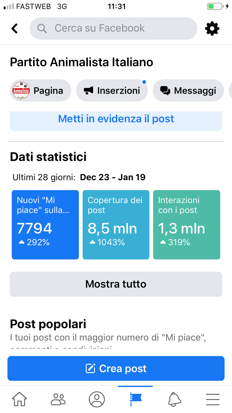 Questo a significare il sempre più crescente interesse degli italiani per le tematiche animaliste e ambientaliste, oltre che al rapporto tra la natura, gli animali e gli uomini. "La cosa non ci sorprende più di tanto - tiene a precisare il Partito Animalista Italiano - in quanto anche dai dati della pagina Facebook notiamo un'incredibile crescita che come mostrano i dati del Social Network ci ha portato, nelle ultime quattro settimane, a rilevare 1 milione e 300 mila interazioni ed una copertura dei nostri post di 8 milioni e mezzo". Questi risultati prima o poi, si rifletteranno anche nelle urne? Il futuro ci dirà.