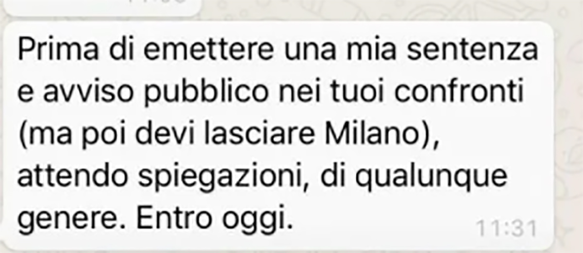 Appena scoperto che il trolley consegnato dal finto imprenditore conteneva dei libri, il “Barone Nero” è andato su tutte le furie. Nei messaggi pubblicati da Garzillo si legge: “Dammi una spiegazione entro un’ora o ti vengo a cercare. Prima di emettere una mia sentenza e avviso pubblico nei tuoi confronti (ma poi devi lasciare Milano) attendo spiegazioni, di qualunque genere, entro oggi”.