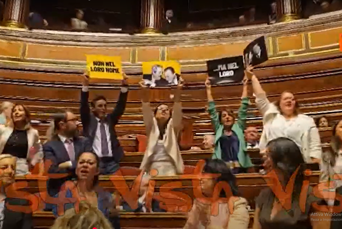 Protesta simbolica del Movimento 5 Stelle in Senato durante la discussione sulla riforma della giustizia: i parlamentari hanno esposto cartelli raffiguranti Giovanni Falcone e Paolo Borsellino per esprimere la loro contrarietà alla separazione delle carriere, accusando la maggioranza di voler portare avanti una legge che, secondo loro, tradisce i valori dei magistrati uccisi dalla mafia.