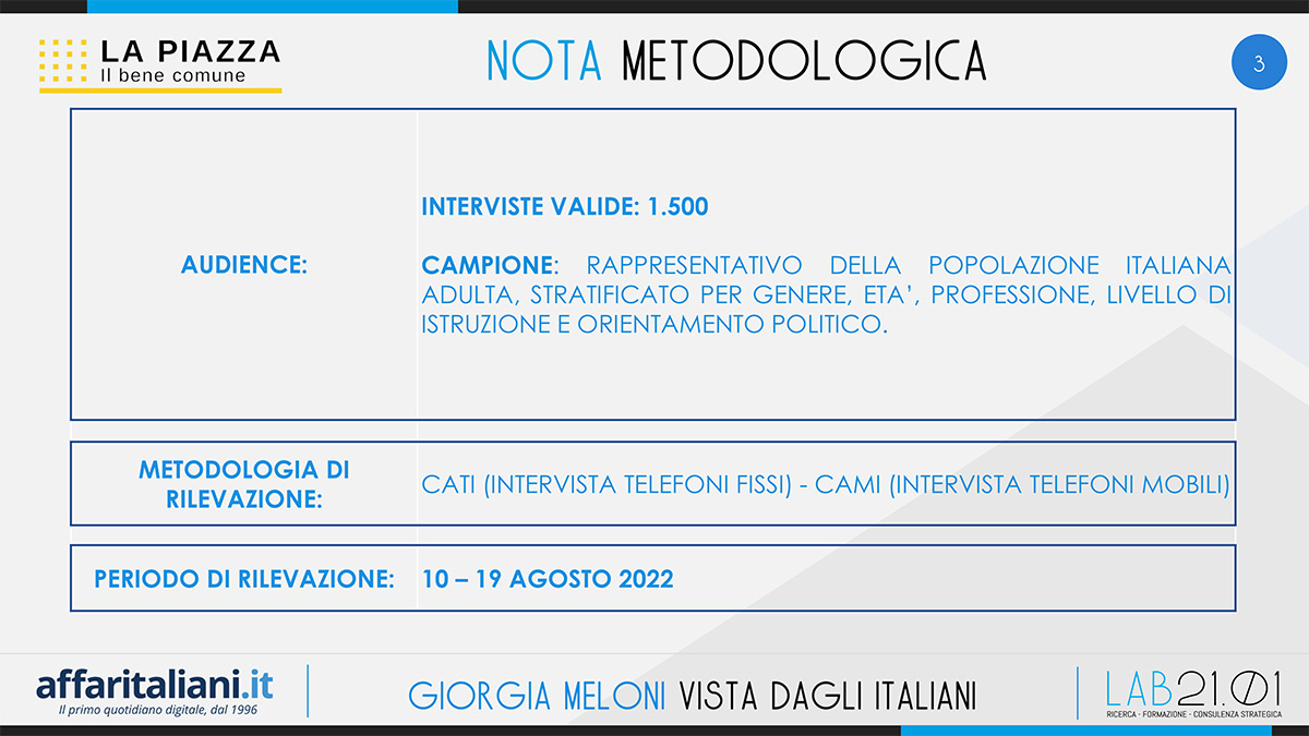 Giorgia Meloni batte Enrico Letta 23,4% a 22,1%: è di quasi un punto e mezzo la distanza tra i due leader certificata dall’ultimo sondaggio di Lab 20.01 realizzato per La Piazza – Il Bene Comune, la kermesse politica di Affaritaliani.it che si terrà il prossimo fine settimana (26-28 agosto) a Ceglie Messapica in provincia di Brindisi.