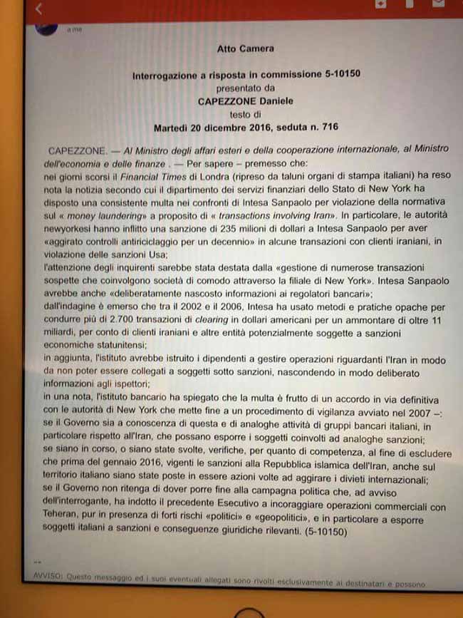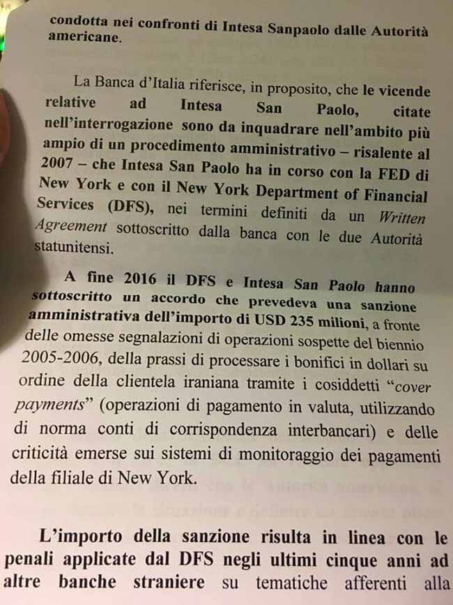 ++ESPLOSIVO IN COMMISSIONE ESTERI (SCOMMETTIAMO CHE LA NOTIZIA SARÀ TACIUTA?). GOVERNO COSTRETTO A CONFERMARE (SU MIA INTERROGAZIONE) L'ESISTENZA DI UNA MULTA USA DI 235 MILIONI DI DOLLARI A UNA BANCA ITALIANA PER "TRANSACTIONS INVOLVING IRAN"+++