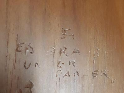 Una piccola svastica è stata incisa nel legno dello stipite interno della porta di uno dei bagni degli onorevoli al piano terra di palazzo Montecitorio. Il simbolo nazista, inciso probabilmente con la punta di una chiave, è seguito da una scritta in tedesco: “Es braust unser Panzer“, ovvero il verso di una canzone della Wehrmacht che tradotto suona “il nostro carro armato sta ruggendo“. La scritta è seguita da unulteriore commento, sempre inciso nel legno: “Ma vai a cagare”.L’episodio è stato denunciato alla presidenza della Camera. Èstato disposto il sequestro della toilette ’incriminata’ e sonostati disposti accertamenti.