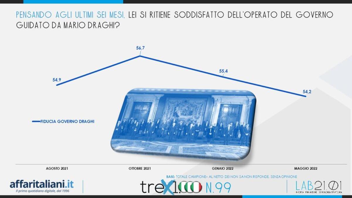 Torna a salire la fiducia in Mario Draghi. A maggio il livello di consenso è pari al 59,4% contro il 56,7% registrato a marzo. Pessime notizie invece per il governo nel suo complesso. Sempre a maggio la soddisfazione per l'operato dell'esecutivo è scesa dal 55,4% di gennaio al 54,2%.