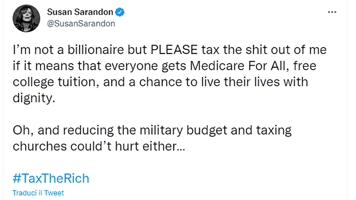 “Tassate i ricchi, me compresa”. Un tweet dell’attrice Susan Sarandon, non nuova a prese di posizione di stampo progressista, riaccende il dibattito sull’introduzione di una patrimoniale negli Stati Uniti.