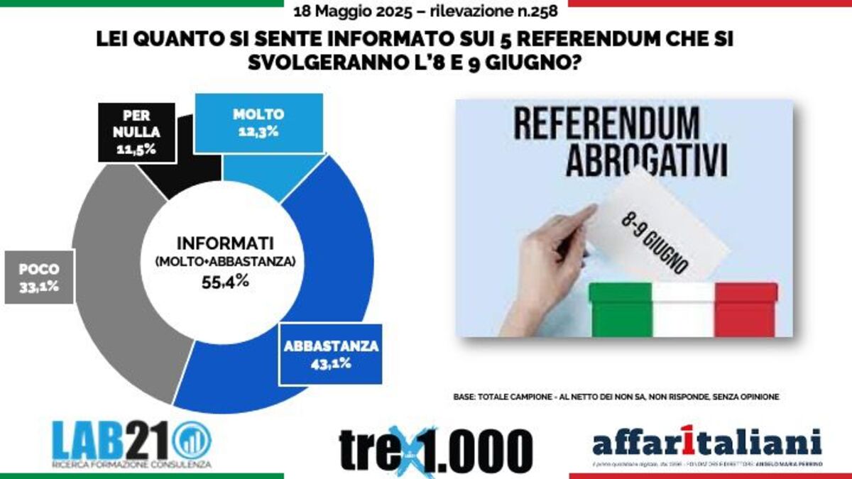Nonostante le proteste dei promotori dei quesiti referendari per la scarsa copertura mediatica in particolare della Rai, ma non solo, il 55,4% degli italiani si ritiene molto o abbastanza informato sull’appuntamento con le urne.