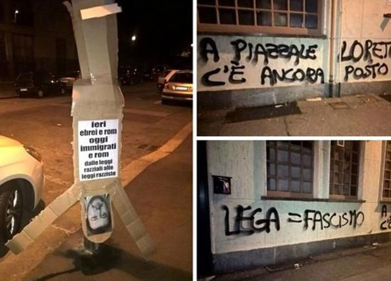 Nello stesso quartiere, in via Cervino, all’esterno della sede del Pd, è comparso un terzo manichino, appeso al contrario. Al posto del volto, la fotocopia sbiadita di una foto di Matteo Renzi. A fianco, la scritta: «Ieri ebrei e rom, oggi immigrati e rom: dalle leggi razziali alle leggi razziste». Indaga la Digos su tutti gli episodi, che ipotizza che si tratti di un blitz del movimento anarchico torinese, che si è sempre professato «antifascista e antileghista».