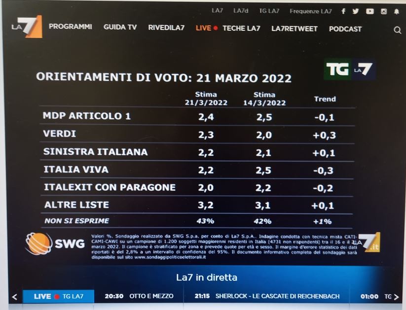 Sostanziale testa a testa tra Fratelli d’Italia di Giorgia Meloni al 21,8% e il Partito democratico di Enrico letta al 21,6%. È quanto risulta dai sondaggi di Swg commissionati dal Tg La7. Seguono la Lega di Matteo Salvini al 16,4% e il Movimento 5 Stelle di Giuseppe Conte al 12,9% che guardano da lontano la vetta. Nella settimana del “non matrimonio” di Silvio Berlusconi la sua Forza Italia registra il 7,8%. Azione/ +Europa stabile sopra la soglia del 5%.