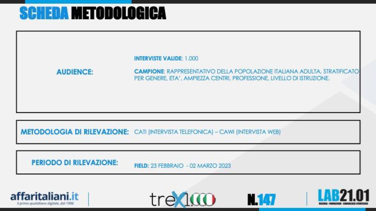 In una settimana, dopo le primarie, il Pd balza dell’1,1% e raggiunge quota 17,3. I 5 Stelle precipitano dello 0,8% al 16,1. Risale il Terzo Polo all’8,4%. Nella maggioranza di Centrodestra, sfiora il 30% con il 29,7 mentre la Lega risale al 9,6%, un dato ampiamente superiore a quello delle elezioni politiche del 25 settembre 2022. In crescita anche Forza Italia. Sale, infine, la fiducia in Giorgia Meloni premier che nell’ultima settimana è passata dal 51,6 al 51,9%.