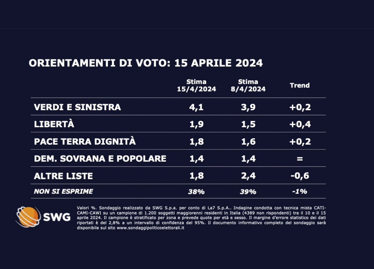 Fratelli d’Italia guadagna terreno e supera il 27,2%. A rivelarlo è il dato principale del sondaggio Swg per il tg de La7. In discesa, invece, il Partito Democratico al 19,4%. Sale, invece, il Movimento 5 Stelle. In calo sia Lega che Forza Italia, rispettivamente all’8,6% e al 8,4%. In discesa anche Stati Uniti d’Europa (5,2%), che stacca di un punto percentuale Azione al 4,2%. Tutti gli altri partiti sotto la soglia di sbarramento per le elezioni europee.
