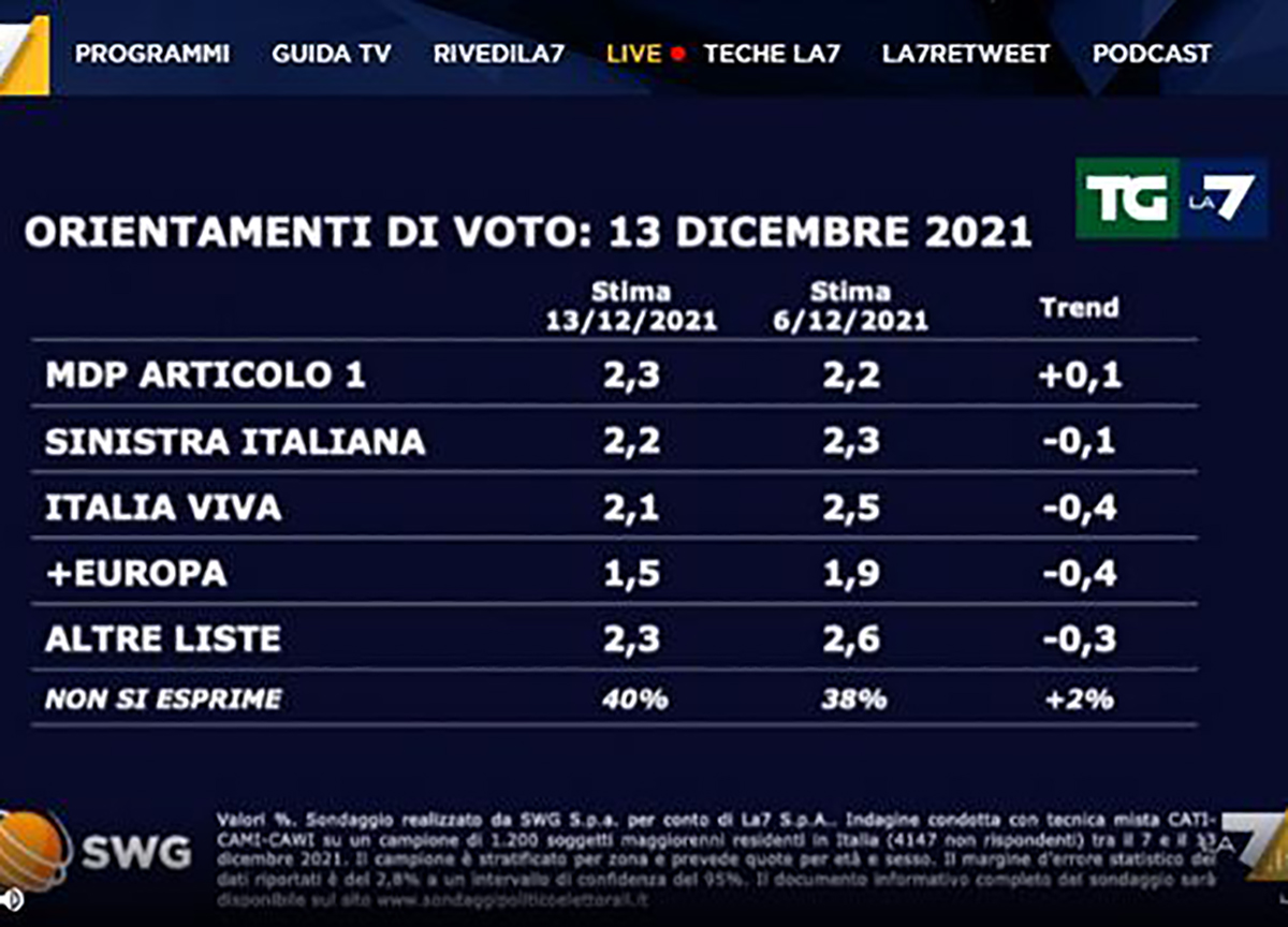 Il Partito democratico di Enrico Letta è il primo partito italiano con il 22.1%. È quanto risulta dal sondaggio di Swg commissionato dal Tg La7. Segue Fratelli d'Italia di Giorgia Meloni con il 20.2%. La Lega di Matteo Salvini guadagna lo 0.5% e sale al 19. Crollo del Movimento 5 Stelle di Giuseppe Conte che perde lo 0.8% e precipita sotto la soglia del 15, esattamente al 14.3%. Cresce Forza Italia di Silvio Berlusconi che si porta al 7.7%.