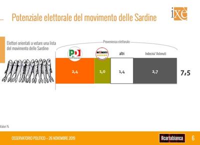 Gli orientamenti degli elettori evidenziano un rilevante potenziale per il movimento delle Sardine, che potrebbe raccogliere il 7,5% dei consensi, drenando voti dal PD, ma anche e soprattutto dall'area dell'astensione. Rispetto alle imminenti elezioni regionali emiliano-romagnole, solo un terzo degli italiani ritiene che in caso di sconfitta del centro sinistra debba dimettersi il Governo Conte. Al contrario, un intervistato su due nega che ci debbano essere ricadute nazionali.