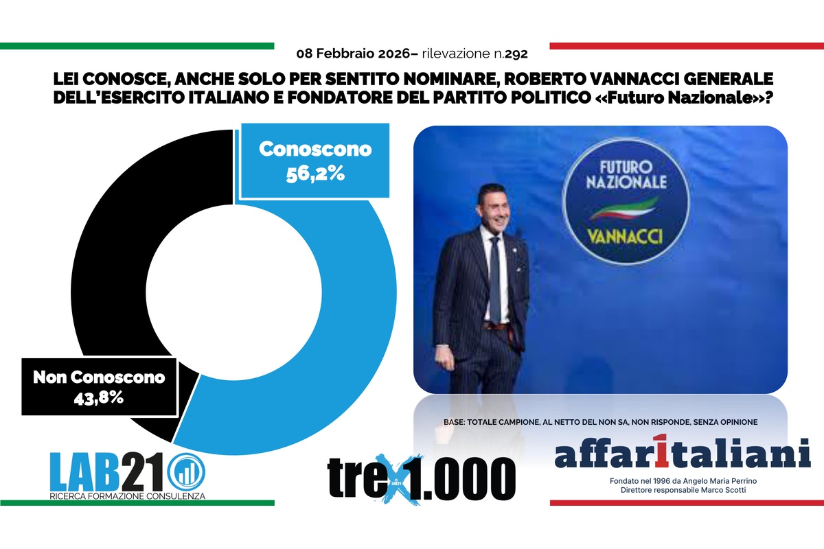 Il “caso” Roberto Vannacci continua a far discutere e a pesare nel dibattito pubblico. Un sondaggio Lab21 per Affaritaliani fotografa tre elementi chiave: il livello di notorietà del generale e leader di Futuro Nazionale, la fiducia personale e la potenziale propensione al voto. Il quadro che emerge è quello di un personaggio ormai ampiamente conosciuto, ma con un bacino elettorale ancora limitato.