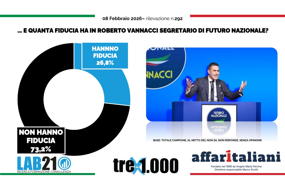 La notorietà, però, non coincide con il consenso personale. Quando si passa alla fiducia nel leader di Futuro Nazionale, il giudizio è nettamente sbilanciato: solo il 26,8% dice di avere fiducia, mentre il 73,2% dichiara di non averne. In altre parole: Vannacci è un “nome noto”, ma resta fortemente polarizzante e, soprattutto, fatica a convertire visibilità in credibilità.