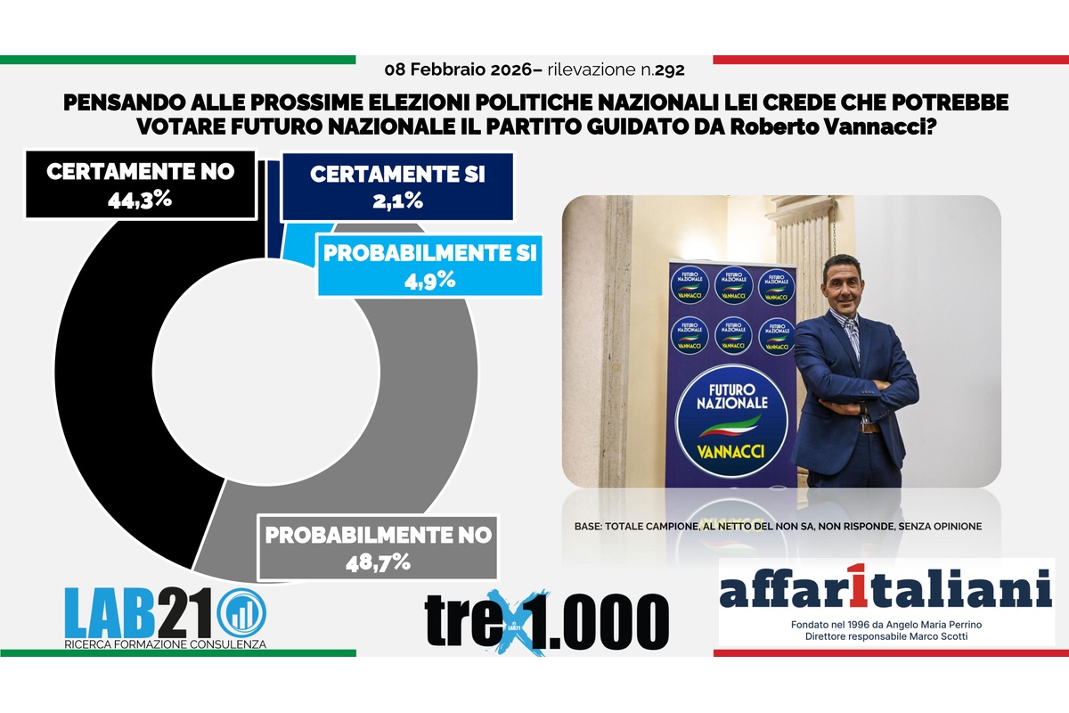 Nella fotografia delle intenzioni di voto, Futuro Nazionale è stimato all’1,7%. Nel complesso, il centrodestra è dato al 49,0% (con Fratelli d’Italia 29,6%, Lega 8,5%, Forza Italia 8,2% e Noi Moderati 1,0%), mentre il centrosinistra nel totale è al 39,3% (con Partito Democratico 20,0%, Movimento 5 Stelle 13,6%, AVS 5,7%). Il punto politico è chiaro: "l’effetto Vannacci” esiste sul piano della visibilità, ma, almeno in questa rilevazione, si traduce in un peso elettorale ancora piccolo, dentro un quadro di coalizioni già molto consolidate.