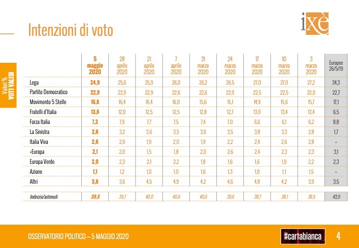 Le intenzioni di voto di questa settimana dell'Istituto Ixè per Cartabianca (RAI 3) fotografano una situazione molto dinamica, con un'accentuazione di alcune tendenze ormai consolidate e altre variazioni meno attese. Accelera la flessione della Lega, che scende al 24,9%, ad appena 2 punti dal PD, ormai stabile da qualche settimana al 22,9%.