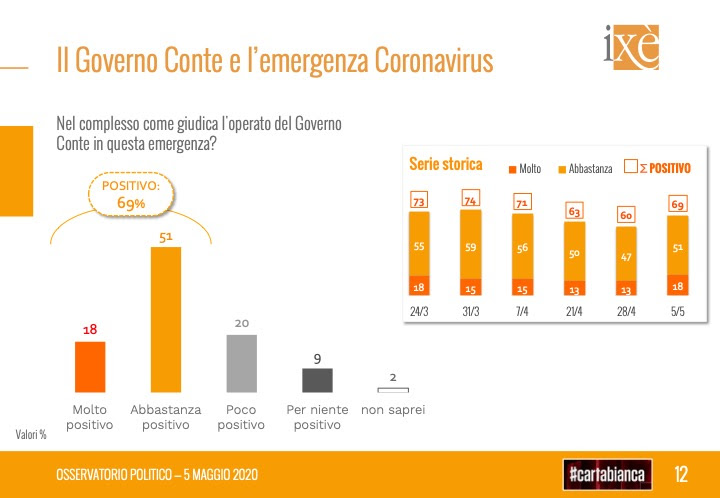Rispetto alla gestione dell'emergenza, con l'ingresso nella fase 2, risale il giudizio sull'operato del Governo, ritenuto in qualche misura positivo dalla netta maggioranza degli italiani (18% molto positivo - 51% abbastanza positivo).