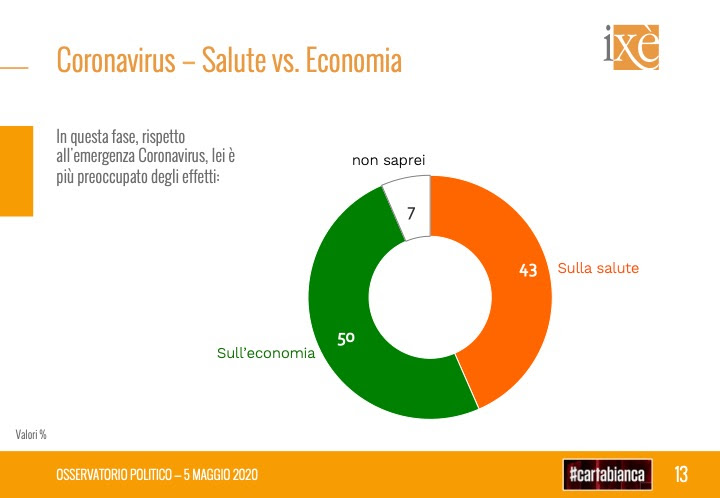 In questa fase, dato anche il perdurante declino della curva dei contagi, metà della popolazione è più preoccupata per le ripercussioni dell'emergenza Covid sull'economia, che per i suoi effetti sulla salute.
