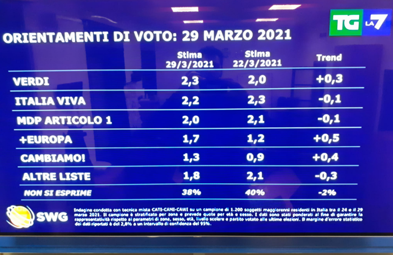 Lega di Matteo Salvini male nei sondaggi. Il Carroccio resta il primo partito italiano anche questa settimana, ma accusa un calo dello 0,7% che lo porta al 22,6%. Guadagna il Pd, anche se solo grazie al fatto che perde di meno: il Partito Democratico di Enrico Letta infatti scende lievemente (0,2%) e passa al 18,8% perdendo dunque la soglia del 19%. Questo secondo i dati di Swg per il Tg La7 di Enrico Mentana del 29 marzo 2021.