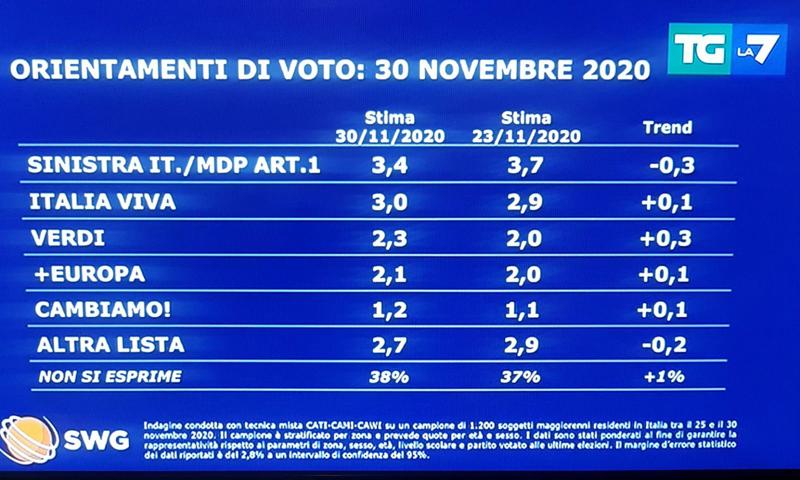 Forza Italia in lieve discesa: gli azzurri di Silvio Berlusconi perdono lo 0,2%, ma restano sopra quota 6% (per la precisione 6,2%). Dietro si registra il sorpasso di Azione: il partito di Calenda cala dello 0,1% ma con il 3,6% è avanti a La Sinistra che scende al 3,4% (era al 3,7% sette giorni fa nei sondaggi Swg). Italia Viva raggiunge quota 3% (+0,1%). Poi i Verdi (2,3% e +0,3%), che precedono +Europa (2,1% +0,1%) e Cambiamo (1,2% +0,1%).