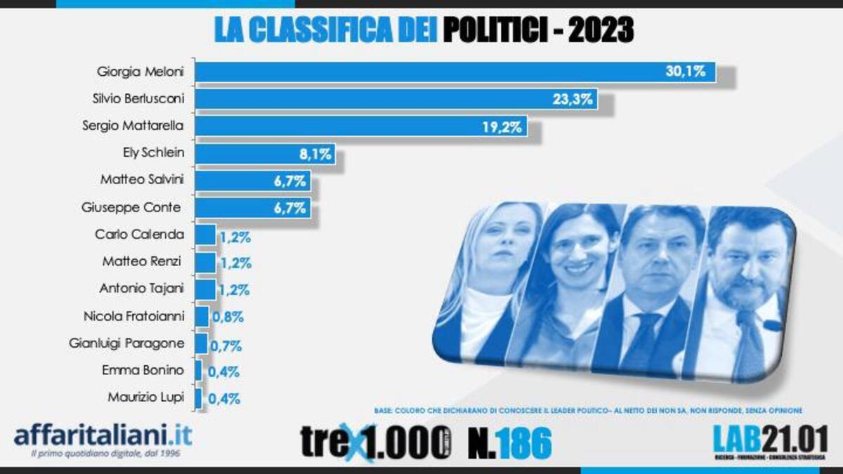 Tra i politici inevitabile la vittoria di Giorgia Meloni, prima donna presidente del Consiglio. Al secondo morto Silvio Berlusconi, morto proprio nel 2023. Solo terzo il presidente della Repubblica Sergio Mattarella. Quarta Elly Schlein davanti a Giuseppe Conte e Matteo Salvini che hanno la stessa percentuale.