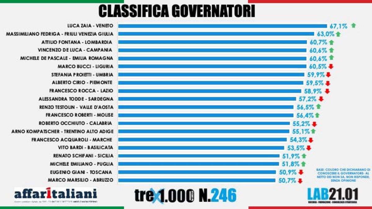 A completare la tripletta leghista al vertice della classifica c’è Attilio Fontana, presidente della regione Lombardia, con un gradimento del 60,7%, anche lui in crescita. Nella top five anche Vincenzo De Luca (Campania) e Michele De Pascale (Emilia Romagna). Ultimo in classifica Marco Marsilio, presidente dell’Abruzzo, penultimo Eugenio Giani (Toscana). Malissimo anche Michele Emiliano, presidente della Puglia.
