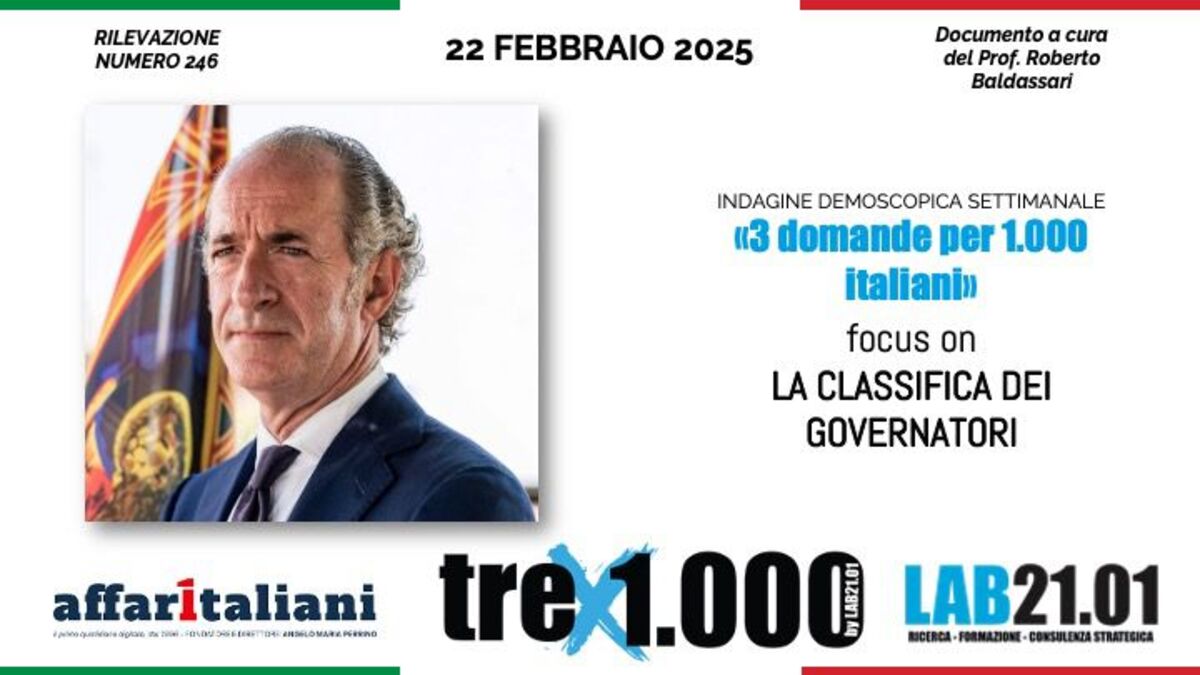 Luca Zaia, presidente della regione Veneto, si conferma nettamente il Governatore più amato d’Italia con una percentuale record del 67,1% in ulteriore crescita rispetto alla precedente rilevazione. E’ il dato principale del sondaggio realizzato per Affaritaliani.it da Roberto Baldassari, direttore generale di Lab21.01. Al secondo posto un altro leghista, il presidente della regione Friuli Venezia Giulia Massimiliano Fedriga con il 63%.