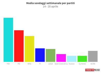 Nell'area di Sinistra, invece, non si registrano grandi cambiamenti. Gli equilibri dell'opposizione restano più o meno gli stessi di una settimana fa. Il Pd non riesce ancora a raggiungere il 20% e in media è sempre a un soffio, al 19,9%, mentre il Movimento 5 Stelle guadagna qualche decimale, andando al 16,3%. Esattamente alla pari, al 3,8%, sono Azione, in ascesa, e l’Alleanza Verdi Sinistra, in leggero calo. Più forte, ma in deciso arretramento, è la lista Stati Uniti d’Europa, che con il 4,9% otterrebbe molto meno della somma di +Europa e Italia Viva.