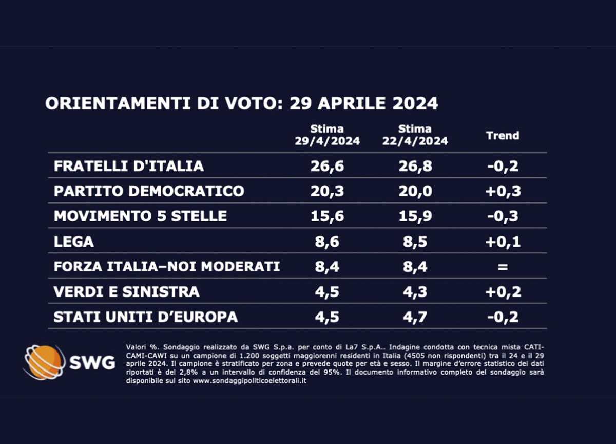 Fratelli d'Italia perde ancora terreno e scivola al 26,6%. E' il dato principale del sondaggio Swg per il tg de La7. Balzo del Pd oltre quota 20%. In calo i 5 Stelle, leggero rialzo per la Lega e stabile Forza Italia. Verdi-Sinistra, Stati Uniti d'Europa e Azione oltre la soglia di sbarramento del 4% prevista per le elezioni europee.