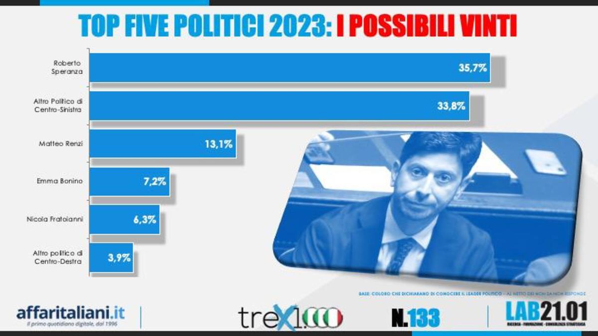 Il principale sconfitto del 2023 sarà l'ex ministro della Salute Roberto Speranza con il 35,7%. Altro politico di Centrosinistra al 33,8% come sconfitto. Matteo Renzi in terza posizione con il 13,1%.