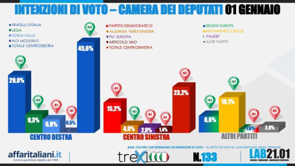 Risale leggermente la fiducia in Giorgia Meloni dal 53,1% al 53,4. Tra i partiti, Fratelli d'Italia torna al 29% mentre la Lega sale ancora e arriva al 9,3%. Disastro Pd al 15,2%, 5 Stelle al 18,1%. Azione-Italia Viva 8,6% in crescita.