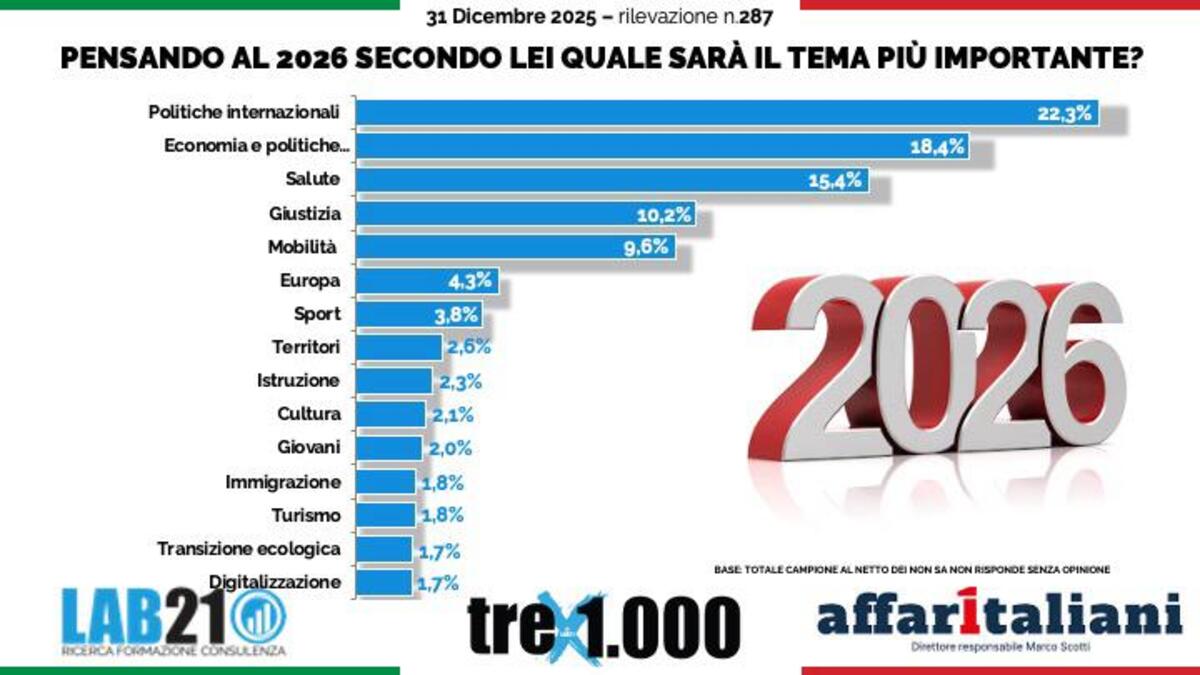 Le politiche internazionali saranno il tema chiave del 2026 seguite da quelle di natura economica. E' quanto emerge dal sondaggio di Capodanno per Affaritaliani realizzato da Roberto Baldassari direttore generale dell'istituto demoscopico Lab21. Importanti anche salute e giustizia.