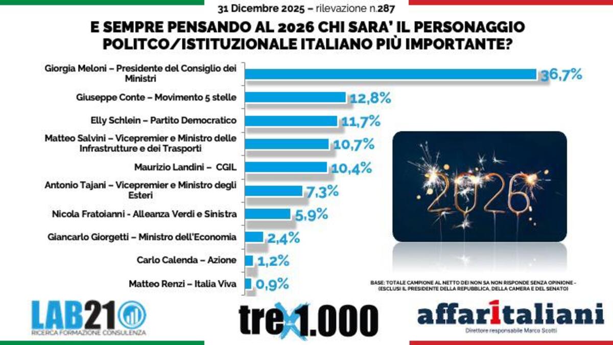 Anche per l'anno nuovo gli italiani ritengono che il personaggio politico chiave sarà la presidente del Consiglio Giorgia Meloni. Interessante che al secondo posto ci sia Giuseppe Conte, leader del M5S, e non la segretaria del Pd Elly Schlein. Il 44,5% del campione infine ritiene che il 2026 sarà uguale all'anno che si è appena concluso.