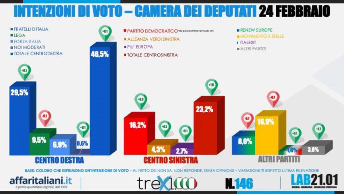 Il caso Superbonus provoca un tonfo della fiducia nella premier Giorgia Meloni, scesa nell'ultima settimana dal 52,4% al 51,6. Tra i partiti, pochissime variazioni nel Centrodestra con la Lega che resta nettamente sopra il dato delle Politiche e Fratelli d'Italia ampiamente la prima forza politica. Il Pd sale al 16,2% nella settimana delle primarie, mentre scivola sotto il 17% il Movimento 5 Stelle. Terzo Polo all'8%. Salgono l'alleanza Verdi-Sinistra e gli altri partiti minori.