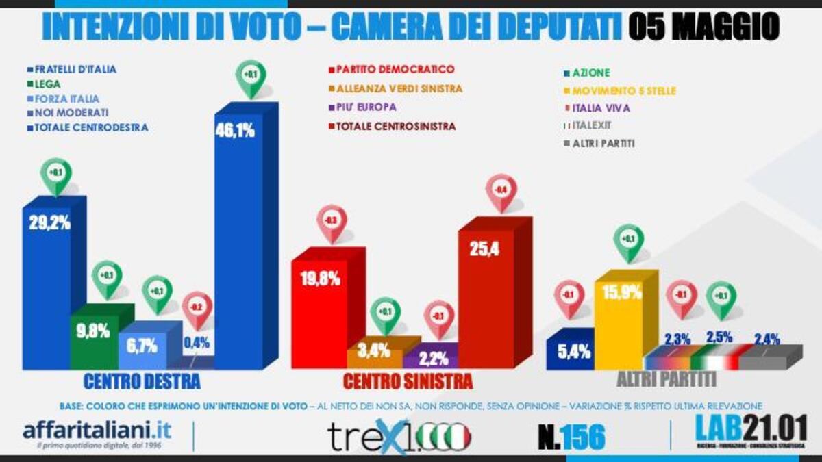 Nella sfida diretta tra Meloni ed Elly Schlein la premier questa settimana guadagna lo 0,2% e arriva al 59,4% mentre la segretaria del Pd scende al 40,6%. Tra i partiti, Fratelli d'Italia risale al 29,2%, la Lega sfiora il 10% (in salita), cresce anche Forza Italia. Il Pd scende sotto quota 20 al 19,8%, i 5 Stelle risalgono al 15,9%.