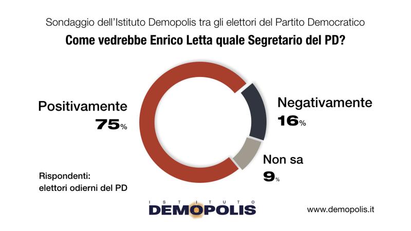 L’Istituto Demopolis, diretto da Pietro Vento, ha misurato nelle ultime 24 ore l’opinione degli elettori del PD sull’ipotesi di affidare, dopo le dimissioni di Zingaretti, la guida del Partito Democratico all’ex Presidente del Consiglio Enrico Letta. Il 75% vedrebbe positivamente Letta quale nuovo Segretario del Partito Democratico. Di parere diverso il 16% degli elettori del PD intervistati da Demopolis.