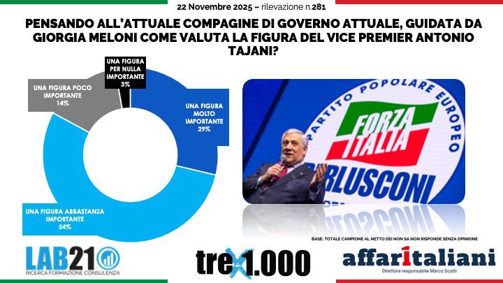 Non solo, il segretario Tajani, titolare della Farnesina, viene considerato per il 29% del campione una figura molto importante nel governo Meloni e per il 54% una figura abbastanza importante. Quindi il giudizio positivo su Forza Italia è duplice. Nelle intenzioni di voto, tra i partiti, Fratelli d'Italia è sempre sopra il 30%, FI stacca di quasi un punto la Lega. In crescita Pd e M5S, sotto il 6% AVS.
