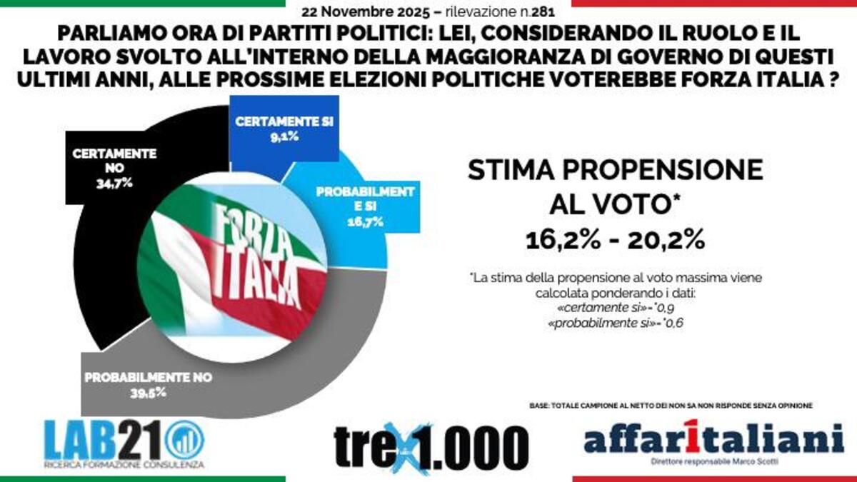 Forza Italia si conferma in gran spolvero e in costante crescita, in attesa dei risultati delle elezioni regionali in Veneto, Puglia e Campania. Secondo il sondaggio realizzato per Affaritaliani da Roberto Baldassari, direttore generale dell'istituto demoscopico Lab21, il partito fondato da Silvio Berlusconi e oggi guidato dal vicepremier e ministro degli Esteri Antonio Tajani ha un potenziale massimo, come bacino elettorale, che oscilla tra il 16,2% e il 20,2%. Una stima ponderata che potrebbe portare gli azzurri a essere addirittura il secondo partito italiano tornando vicinissimo ai fasti dell'epoca di Berlusconi presidente.