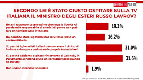 Ancora superiore (31,6%) la quota di intervistati che ritiene giusto dare parola a Lavrov “perché quando abbiamo ospitato l’intervento di Zelensky in Parlamento, questi non ha avuto un contraddittorio”. Chi invece critica la scelta di Rete4 sostiene chi rappresenta un regime che nega la libertà di parola ed è responsabile di crimini di guerra non può fare un comizio sulla tv italiana (19,3%), mentre un ulteriore 16,2% avrebbe considerato legittima l’intervista solo se vi fosse stato contraddittorio, affermando quindi una critica nei confronti di Brindisi.