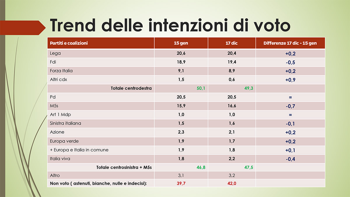 Sondaggio, il centrodestra supera il 50%, con consenso che avanza tra dicembre e gennaio