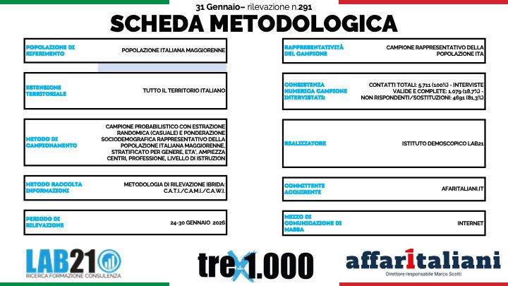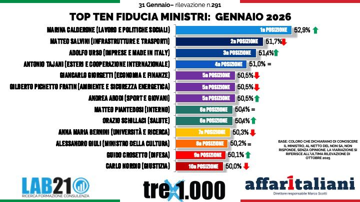 Tra i ministri del governo Meloni, a gennaio è ancora la titolare del Lavoro e del Welfare Marina Calderone a guidare la classifica della fiducia degli italiani con una percentuale, in crescita rispetto alla precedente rilevazione, pari al 52,9%. In seconda posizione Matteo Salvini, vicepremier e ministro delle Infrastrutture e dei Trasporti. Sul terzo gradino del podio Adolfo Urso, titolare del dicastero delle Imprese e del Made in Italy. Tra i partiti, nelle intenzioni di voto, poche le variazioni rispetto alla settimana precedente.