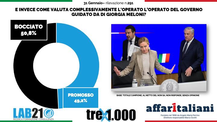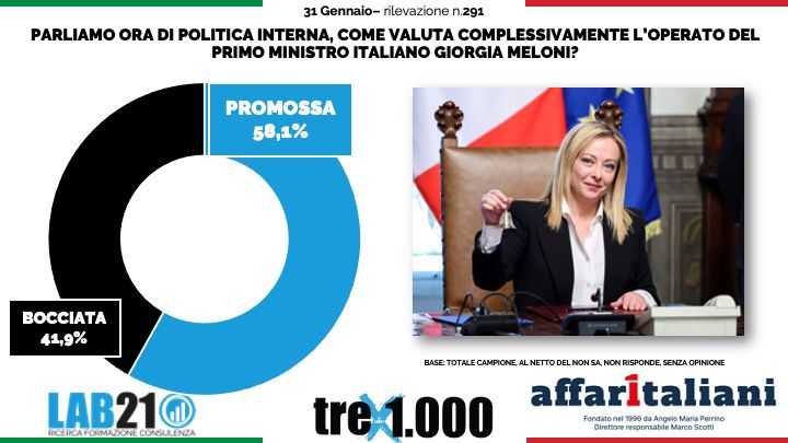 Il 58,1% degli italiani, quasi sei su dieci, giudica positivamente l’operato della presidente del Consiglio Giorgia Meloni dal punto di vista complessivo della politica interna. Un dato che ben oltre la somma dei partiti della maggioranza di Centrodestra. Premier ‘bocciata’ solo dal 41,9% degli intervistati. E’ il principale risultato del sondaggio realizzato per Affaritaliani da Roberto Baldassari, direttore generale dell’istituto demoscopico Lab21. Italiani spaccati a metà invece nella valutazione del governo nel suo complesso.