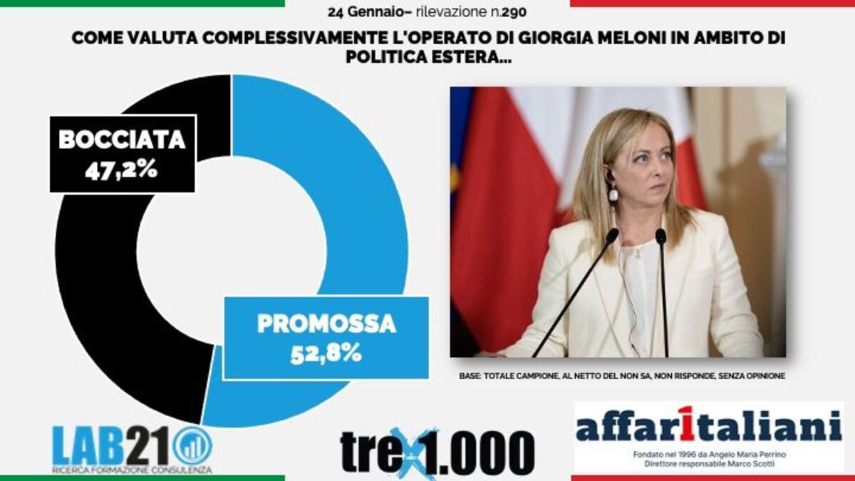 Il 52,8% degli intervistati giudica positivamente (promossa) la politica estera della presidente del Consiglio Giorgia Meloni. Premier bocciata a livello internazionale dal 47,2% degli italiani. Tra i partiti, nelle intenzioni di voto, Fratelli d'Italia si conferma sopra il 30% e la Lega davanti a Forza Italia. Pd sopra il 20%, in leggero rialzo il M5S e AVS sotto il 6%.