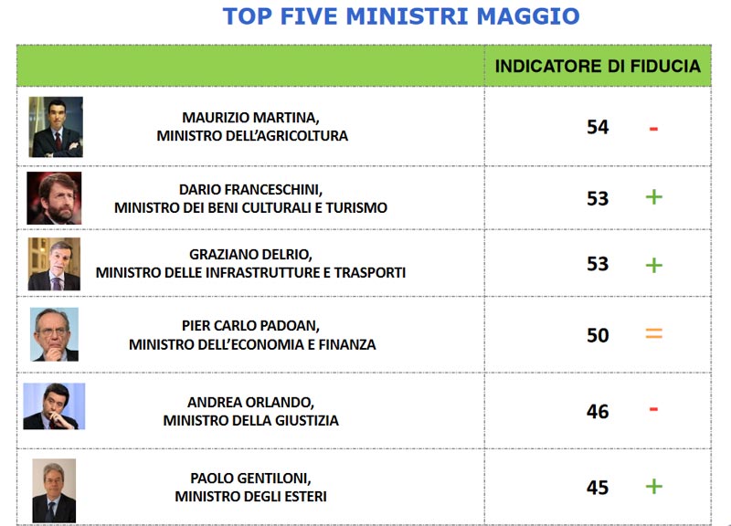 Nel mese di maggio il ministro più amato del governo Renzi con il 54% di gradimento è Maurizio Martina (Agricoltura). In seconda posizione al 53% Dario Franceschini (Beni Culturali e Turismo) e Graziano Delrio (Infrastrutture e Trasporti). Quarto al 50% Pier Carlo Padoan (Economia), seguito da Andrea Orlando (Giustizia) al 46% e da Paolo Gentiloni (Esteri) al 45%.