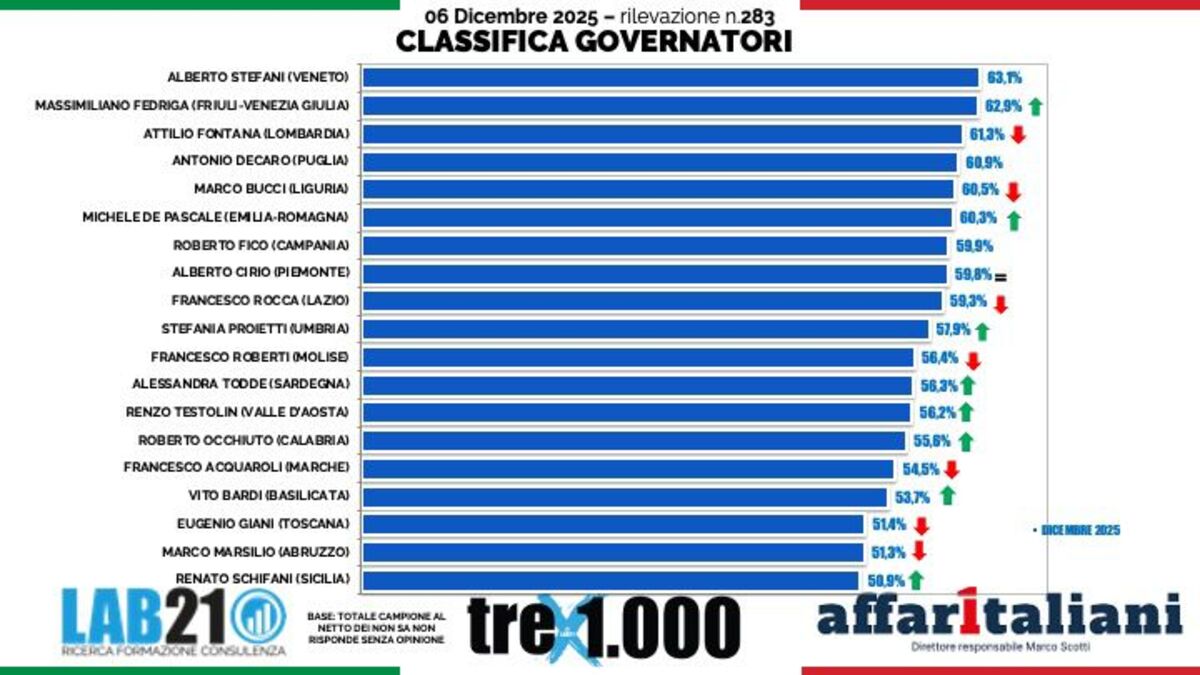 Sondaggi, Stefani subito primo nella classifica dei presidenti di regione. Decaro quarto. Fico più indietro, settimo sotto il 60%