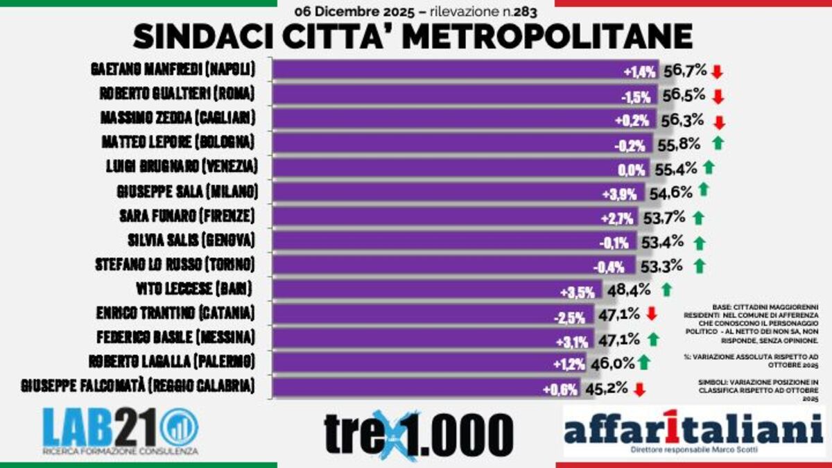 Sindaci delle grandi città, Napoli con Manfredi al primo posto. Ottima seconda posizione per Gualtieri (Roma)