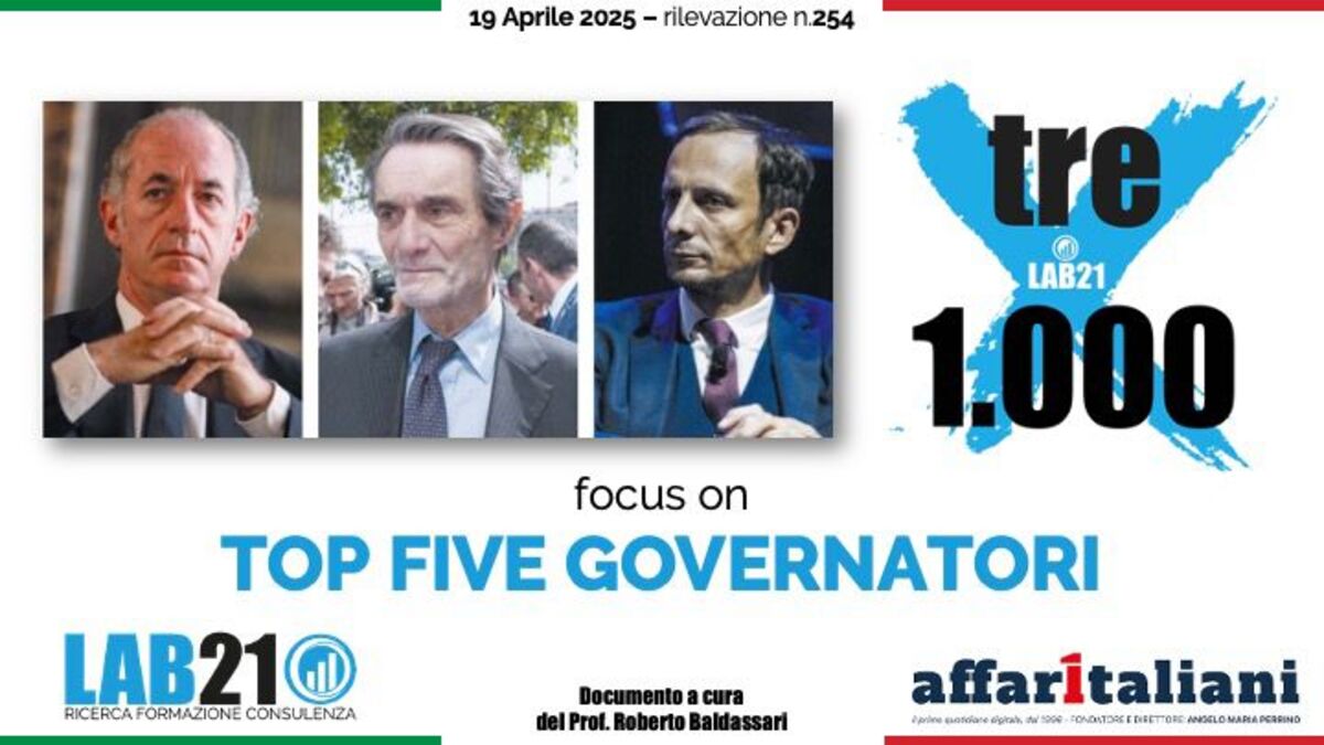 Quarti Vincenzo De Luca (Campania) e Michele De Pascale (Emilia Romagna), chiude la top five dei Governatori in quinta posizione Francesco Rocca, presidente della regione Lazio