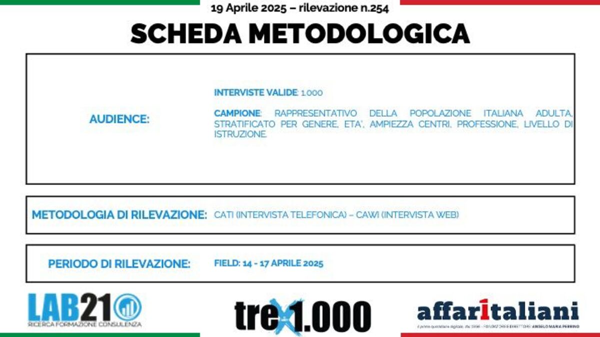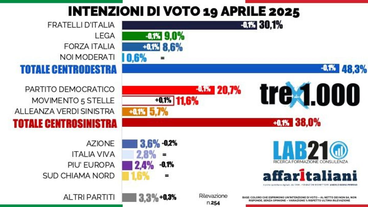 Tra i partiti, nelle intenzioni di voto, pochissime le variazioni nel Centrodestra con Fratelli d’Italia che rimane sopra il 30% e la Lega davanti a Forza Italia. Il Pd perde ancora terreno mentre salgono leggermente Movimento 5 Stelle e Alleanza Verdi Sinistra. Azione di Carlo Calenda batte Italia Viva di Matteo Renzi.