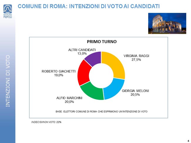 Virginia Raggi, candidata sindaco del Movimento 5 Stelle resta saldamente in testa alle intenzioni di voto per le elezioni comunali di Roma con il 27,5%. E' quanto emerge da un sondaggio realizzato dall'Istituto Piepoli, e pubblicato su Affaritaliani.it, dopo il ritiro di Guido Bertolaso e la decisione di Forza Italia di appoggiare Alfio Marchini.