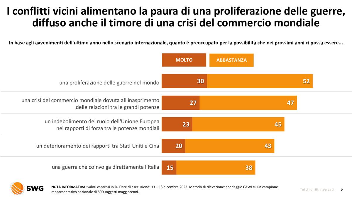Si conferma la tendenza degli italiani ad auspicare un’Europa con una propria politica estera più autorevole ed emancipata dalle grandi potenze, soprattutto dagli Stati Uniti, posizione sostenuta con maggiore forza dagli elettori di centrosinistra. In prospettiva, l’augurio per il 2024 è soprattutto che cessino le ostilità belliche, anche perché la possibilità di una proliferazione dei conflitti è in cima alle preoccupazioni dei cittadini per i prossimi anni. A destare timori è anche il lato economico, ovvero l’inflazione ma anche il rischio di crisi commerciali dovute al deterioramento delle relazioni tra Cina, Stati Uniti e altri grandi attori nello scenario globale.